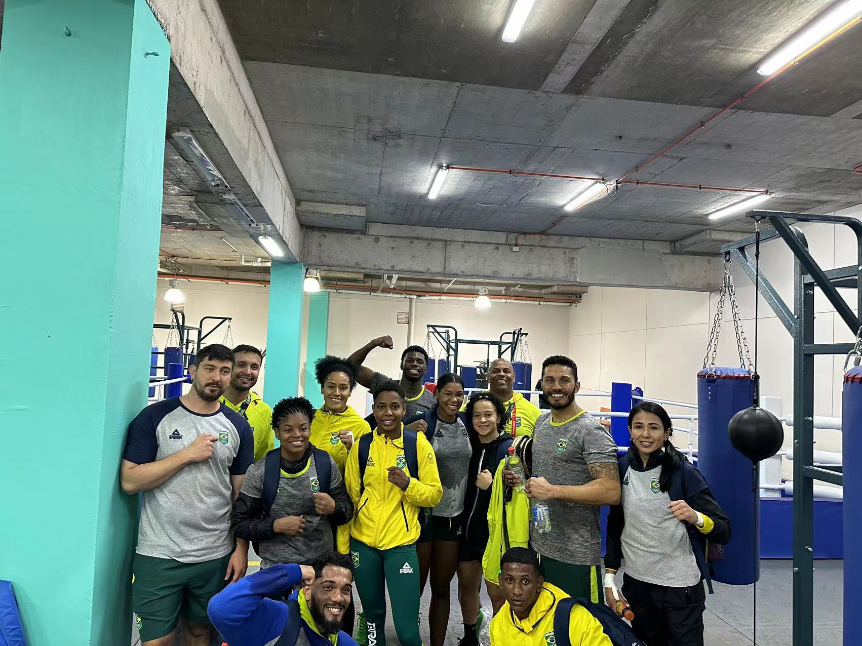 △ 参赛选手在米兰·(milan)中国官方网站体育拳击器材旁合影留念